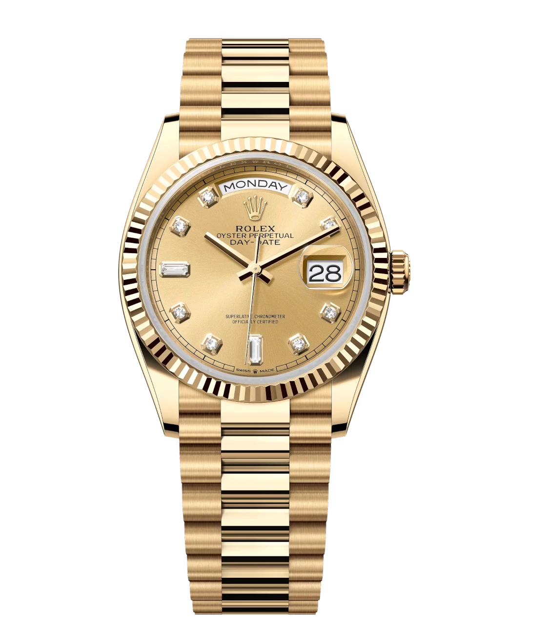 Rolex Day-Date 36 Oyster Perpetual 18 ct yellow gold champagne-colour, diamond-set dial fluted bezel President band Reference 128238