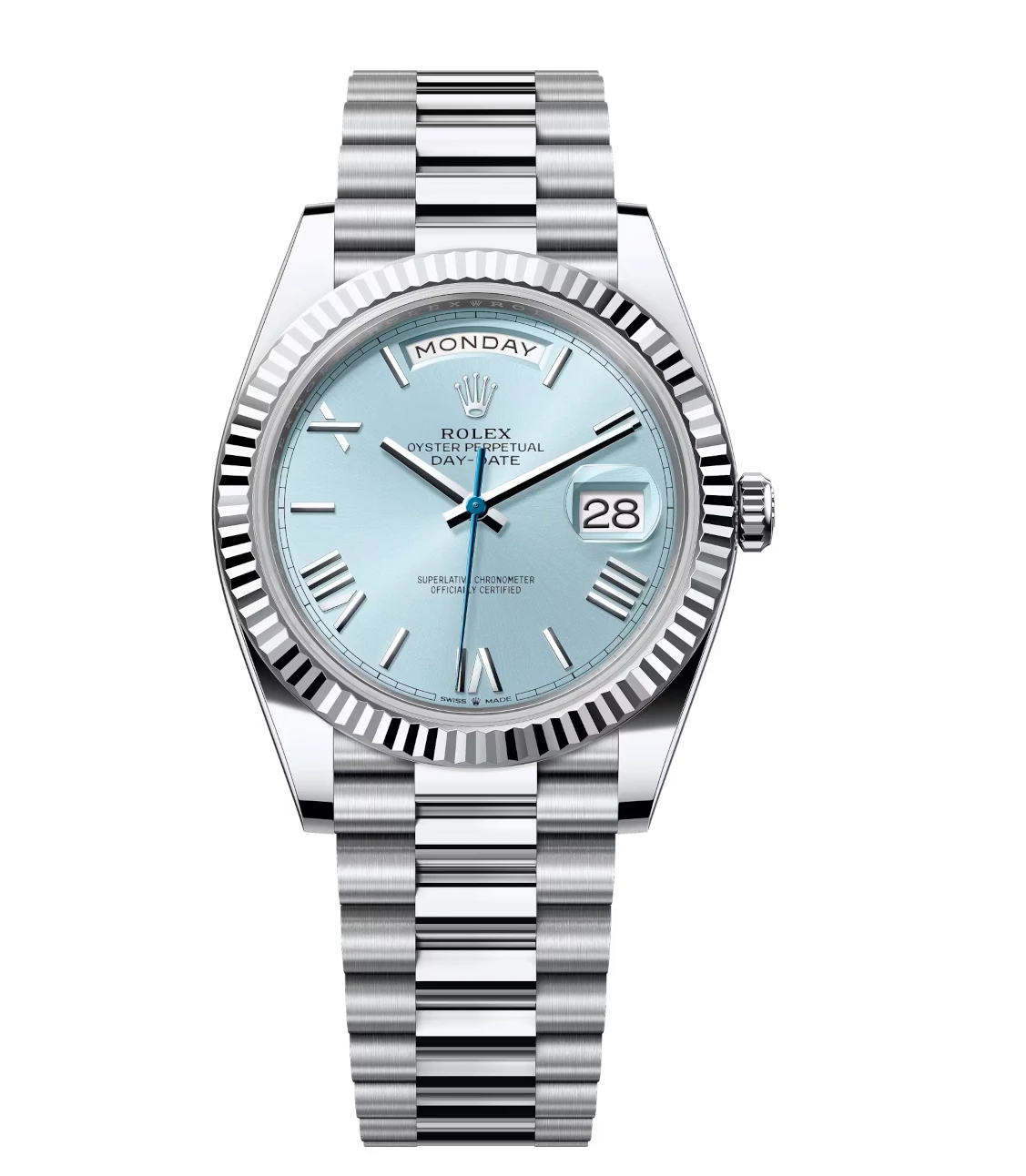 Rolex Day-Date 40 Oyster Perpetual platinum ice-blue dial fluted bezel President band Reference 228236