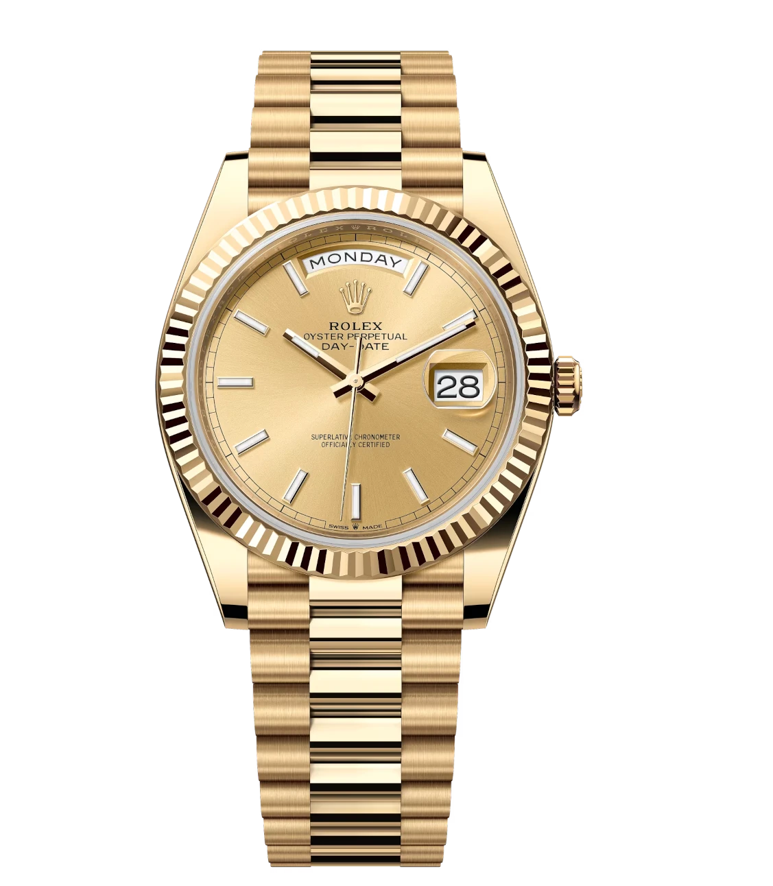 Rolex Day-Date 40 Oyster Perpetual 18 ct yellow gold champagne-colour dial fluted bezel President band Reference 228238