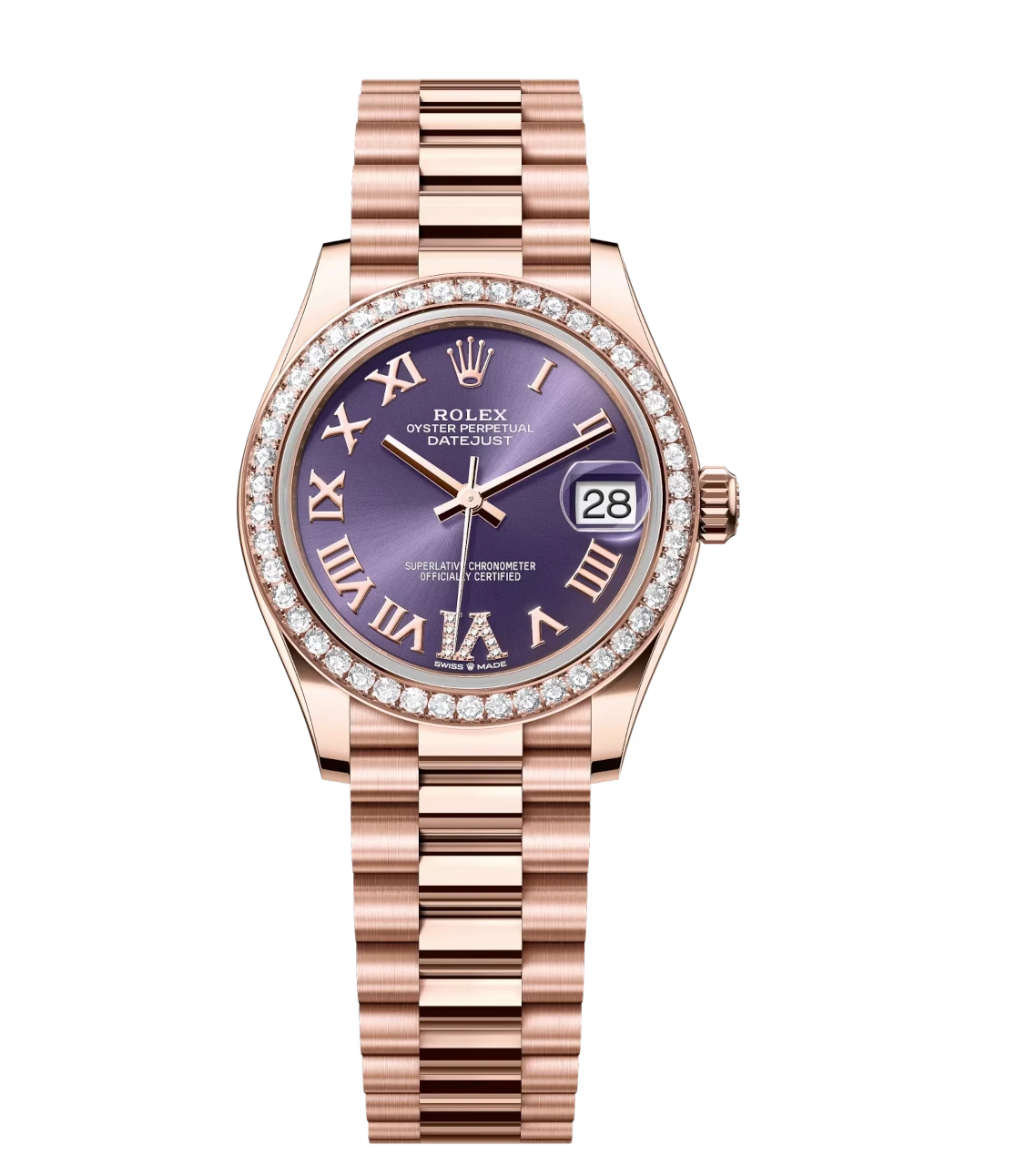 Rolex Datejust 31 Oyster Perpetual 18 ct Everose gold aubergine, diamond-set dial President band Reference 278285RBR