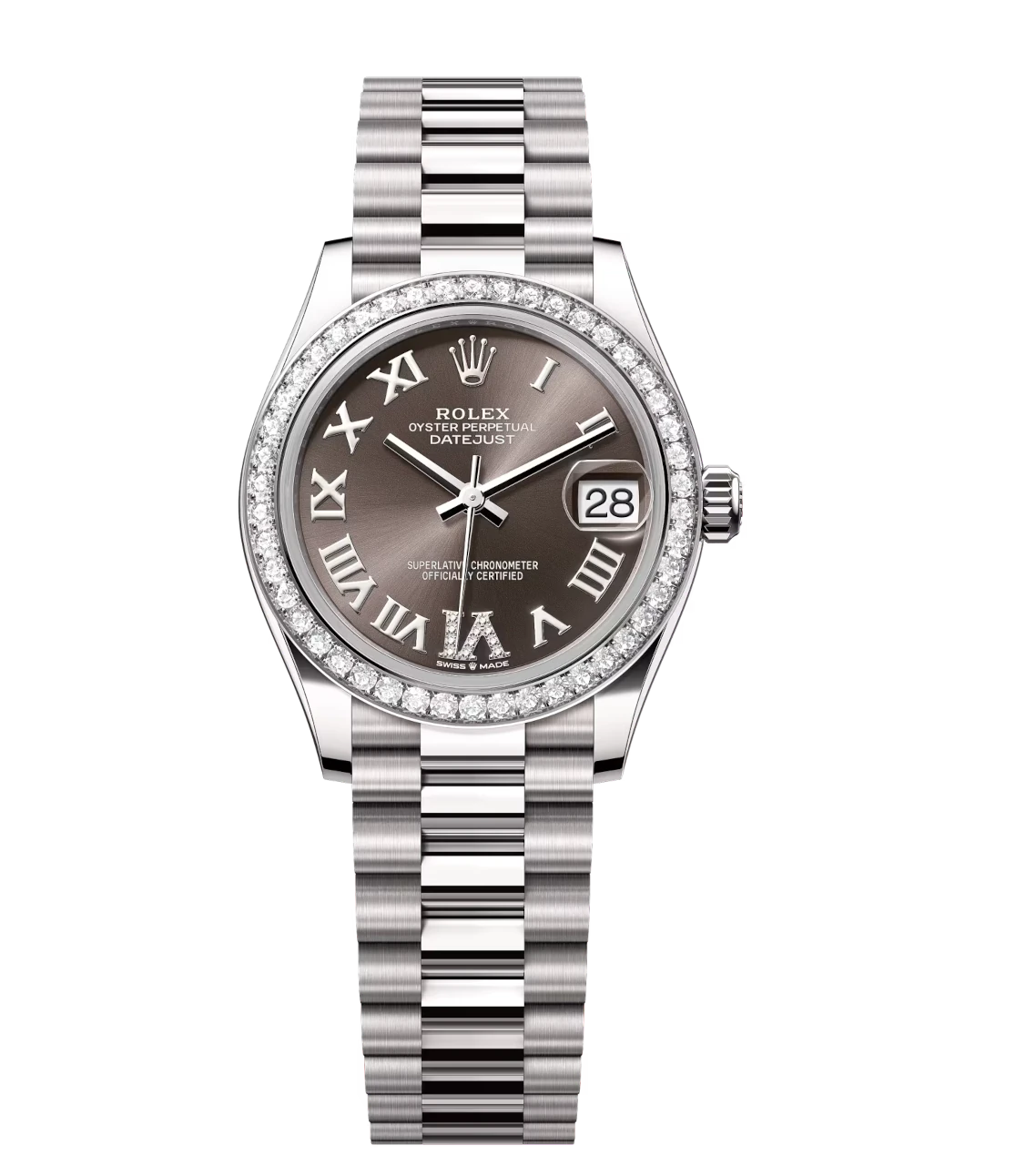 Rolex Datejust 31 Oyster Perpetual 18 ct white gold dark grey, diamond-set dial President band Reference 278289RBR