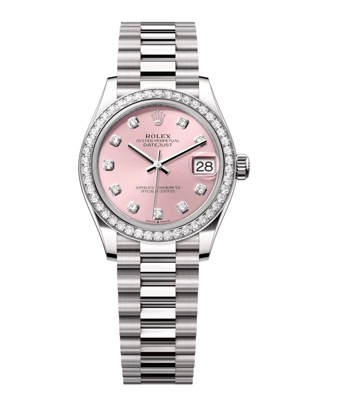 Rolex Datejust 31 Oyster Perpetual 18 ct white gold pink, diamond-set dial President band Reference 278289RBR