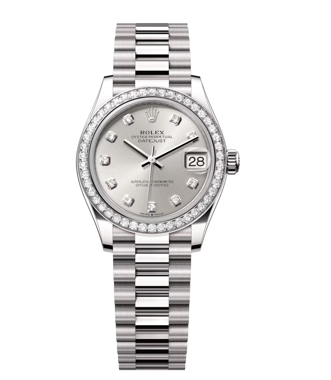 Rolex Datejust 31 Oyster Perpetual 18 ct white gold silver, diamond-set dial President band Reference 278289RBR