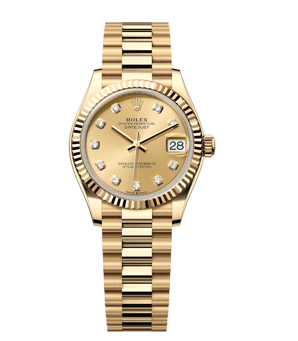 Rolex Datejust 31 Oyster Perpetual 18 ct yellow gold champagne colour, diamond-set dial President band Reference 278278