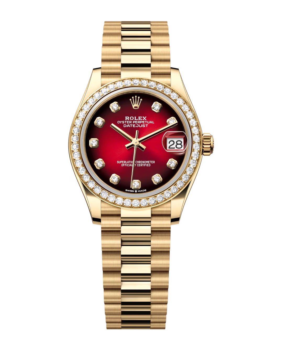 Rolex Datejust 31 Oyster Perpetual 18 ct yellow gold red ombré, diamond-set dial President band Reference 278288RBR
