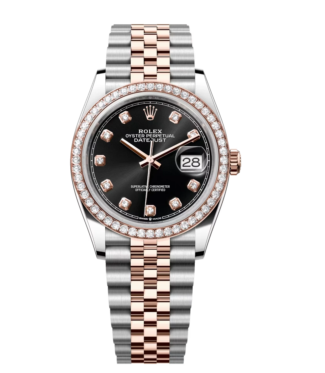 Rolex Datejust 36 Oyster Perpetual Oystersteel and Everose gold bright black, diamond-set dial Jubilee band Reference 126281RBR