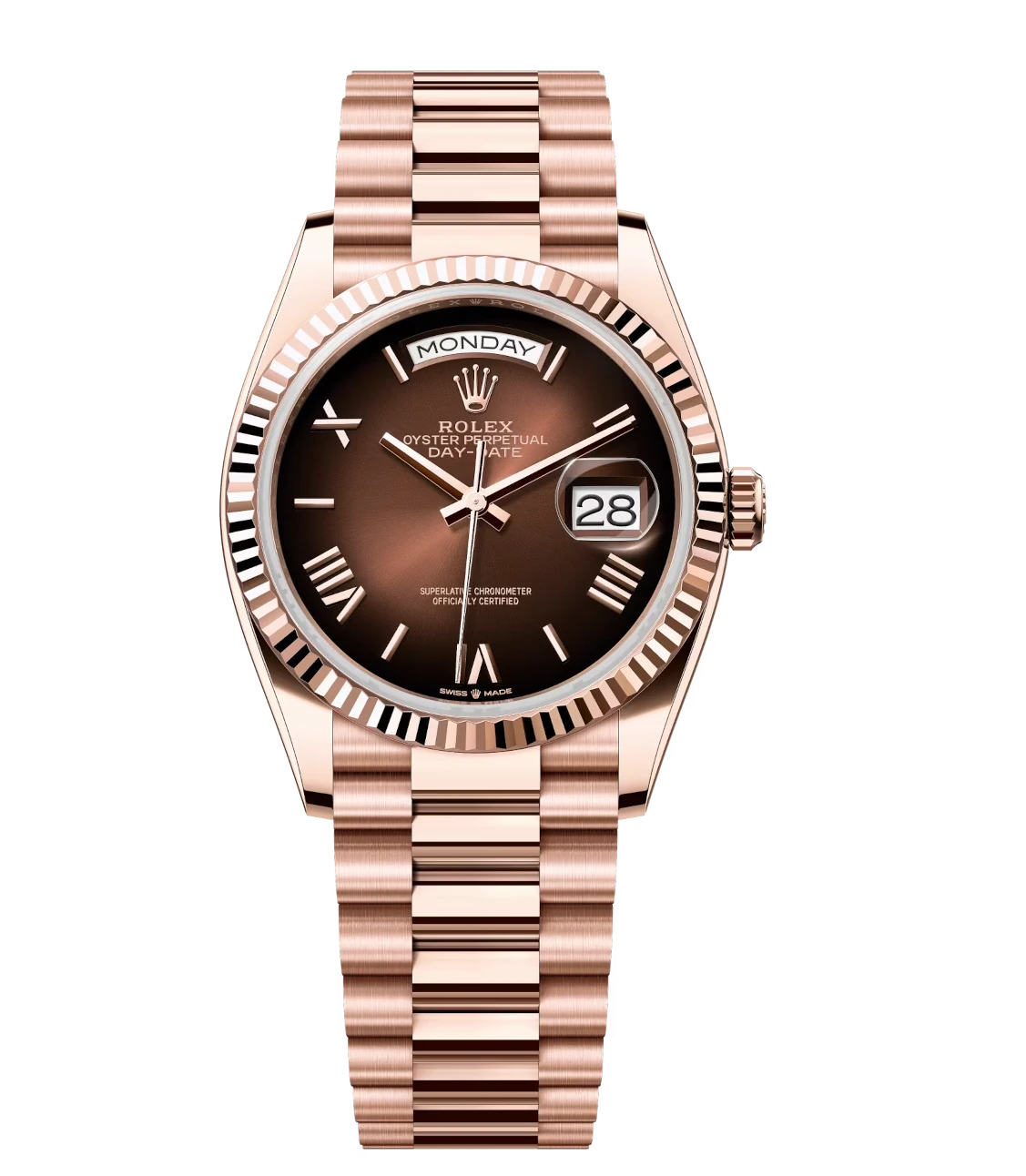 Rolex Day-Date 36 Oyster Perpetual 18 ct Everose gold brown ombré dial fluted bezel President band Reference 128235