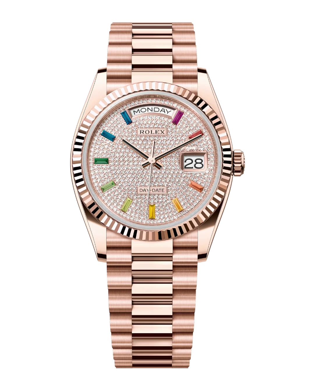 Rolex Day-Date 36 Oyster Perpetual 18 ct Everose gold diamond-paved dial fluted bezel President band Reference 128235