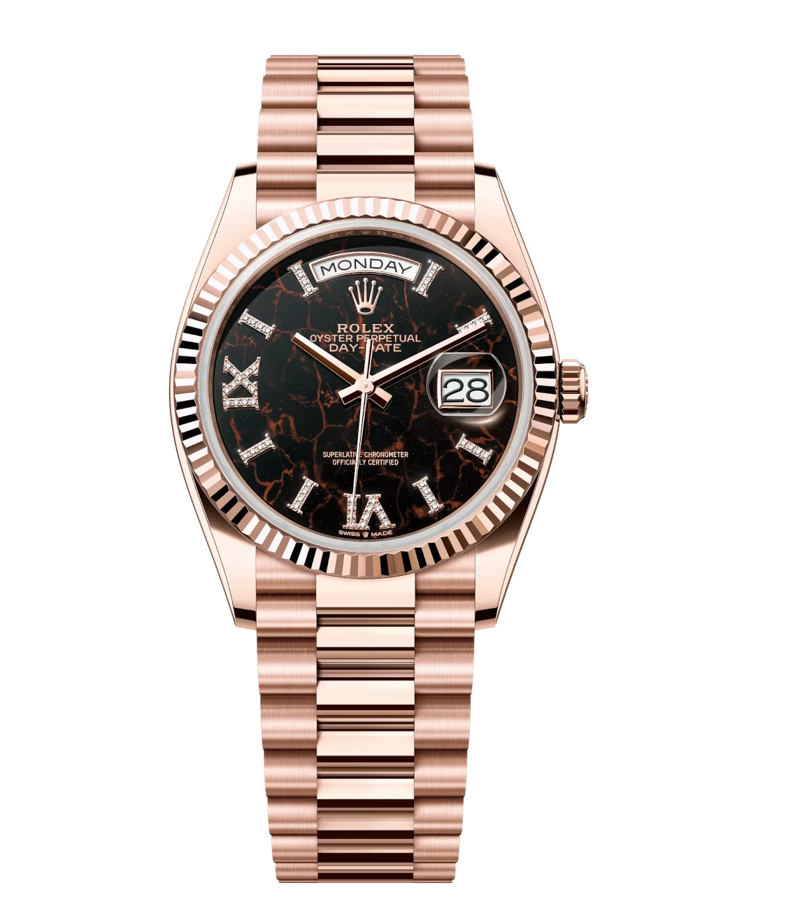 Rolex Day-Date 36 Oyster Perpetual 18 ct Everose gold eisenkiesel, diamond-set dial fluted bezel President band Reference 128235