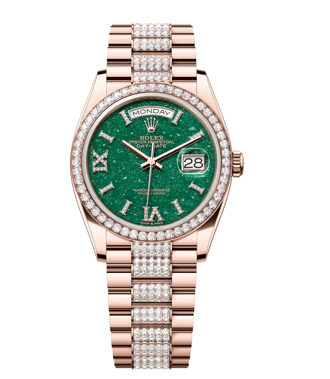 Rolex Day-Date 36 Oyster Perpetual 18 ct Everose gold green aventurine, diamond-set dial diamond-set bezel diamond-set President band Reference 128345RBR