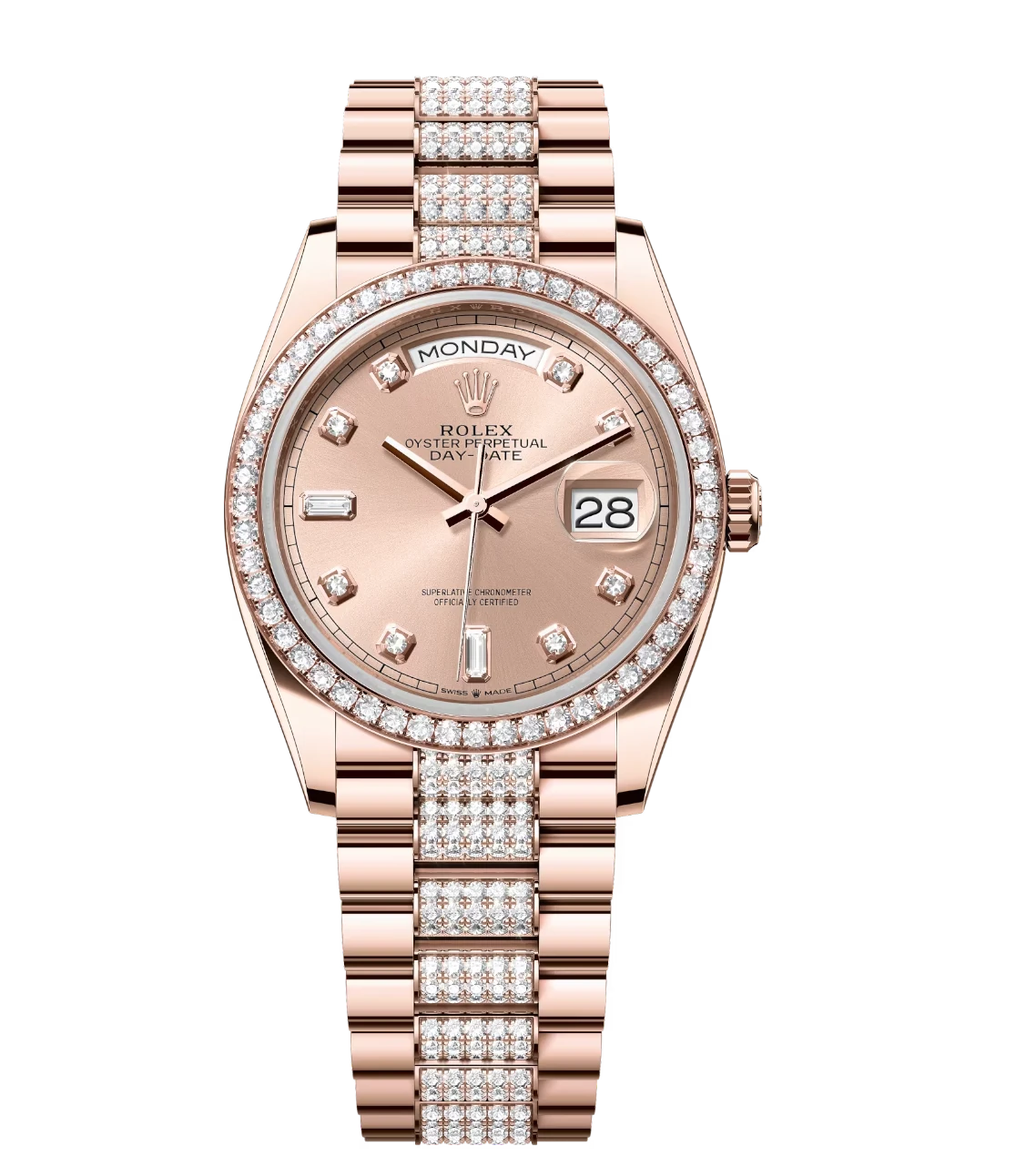 Rolex Day-Date 36 Oyster Perpetual 18 ct Everose gold rosé colour, diamond-set dial diamond-set bezel diamond-set President band Reference 128345RBR
