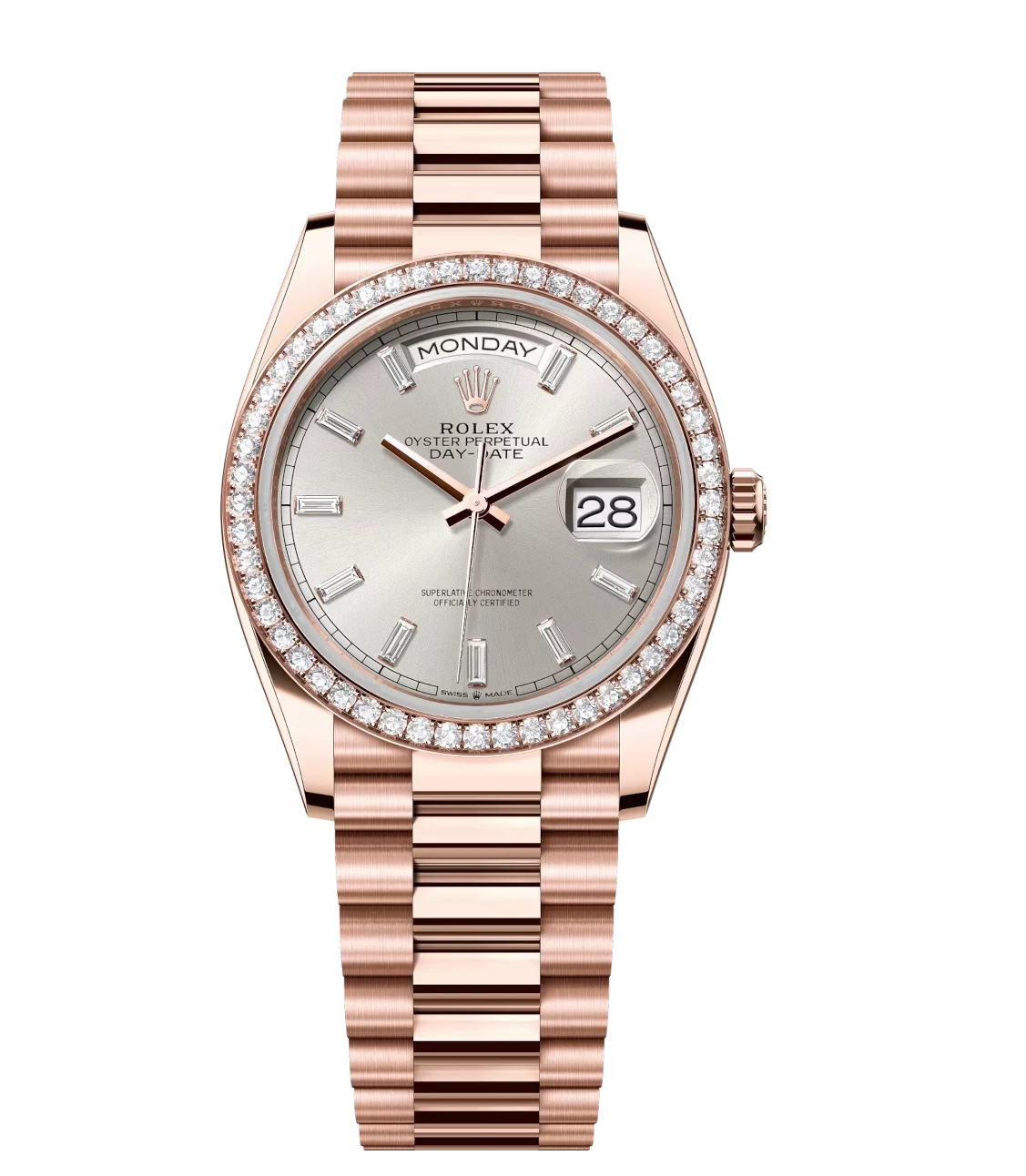 Rolex Day-Date 36 Oyster Perpetual 18 ct Everose gold silver, diamond-set dial diamond-set bezel President band Reference 128345RBR