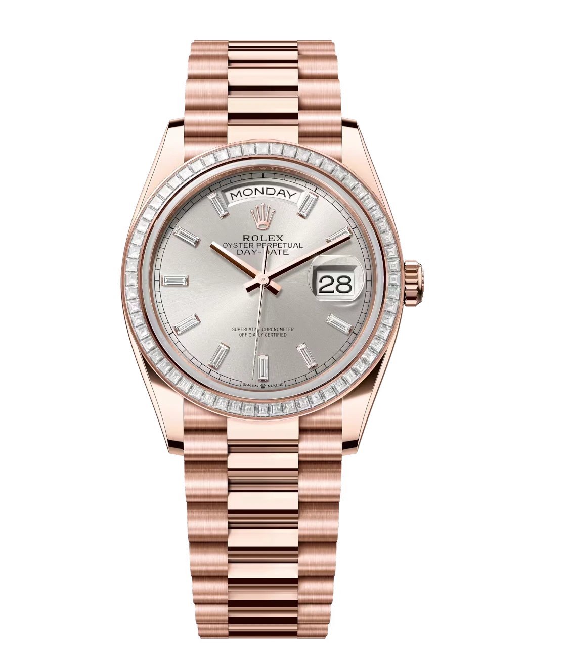 Rolex Day-Date 36 Oyster Perpetual 18 ct Everose gold silver, diamond-set dial diamond-set bezel President band Reference 128395TBR