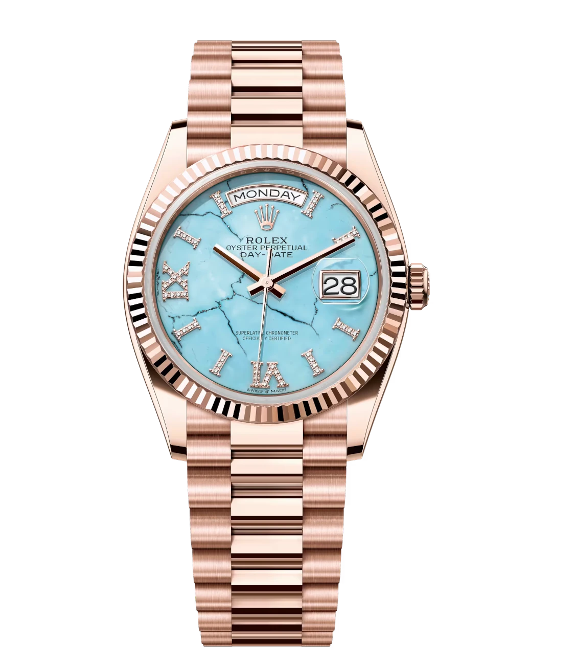 Rolex Day-Date 36 Oyster Perpetual 18 ct Everose gold turquoise, diamond-set dial fluted bezel President band Reference 128235