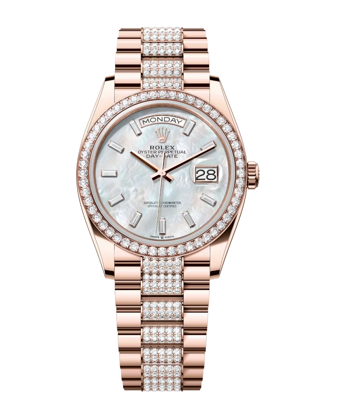 Rolex Day-Date 36 Oyster Perpetual 18 ct Everose gold white mother-of-pearl, diamond-set dial diamond-set bezel diamond-set President band Reference 128345RBR