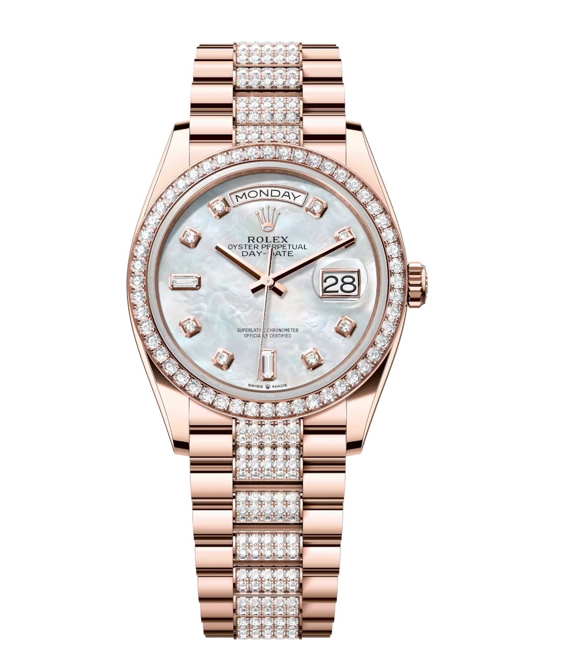Rolex Day-Date 36 Oyster Perpetual 18 ct Everose gold white mother-of-pearl, diamond-set dial diamond-set bezel diamond-set President band Reference 128345RBR
