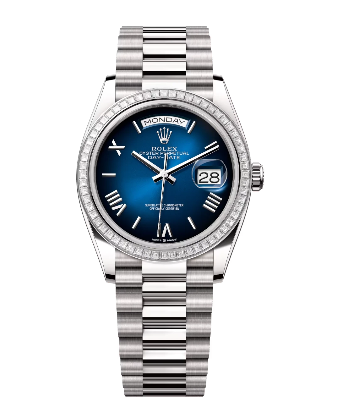 Rolex Day-Date 36 Oyster Perpetual 18 ct white gold blue ombré dial diamond-set bezel President band Reference 128399TBR