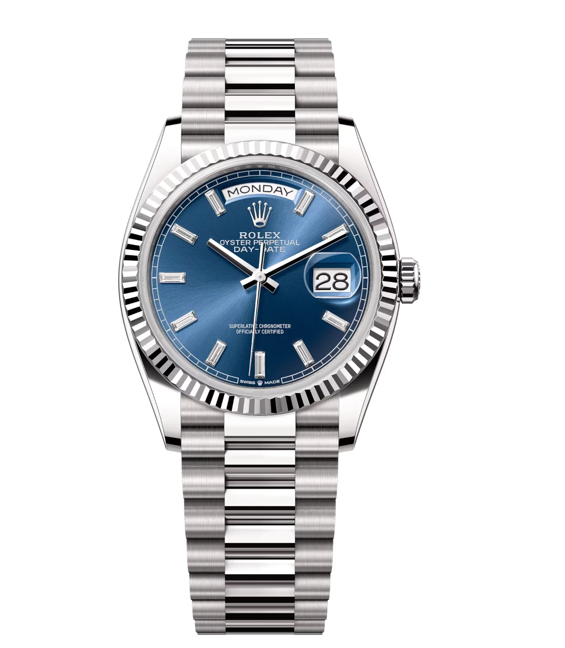 Rolex Day-Date 36 Oyster Perpetual 18 ct white gold bright blue, diamond-set dial fluted bezel President band Reference 128239