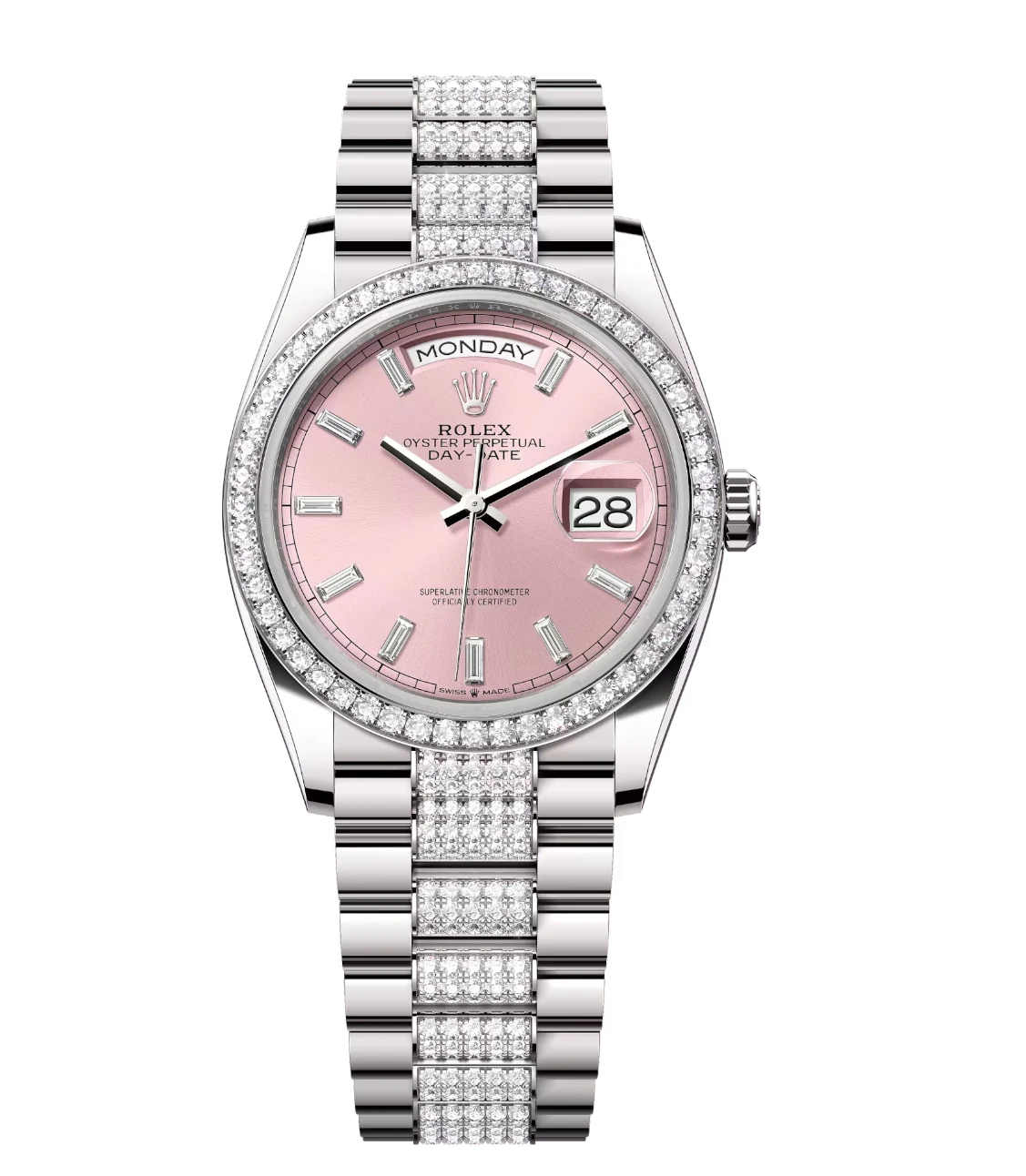 Rolex Day-Date 36 Oyster Perpetual 18 ct white gold pink, diamond-set dial diamond-set bezel diamond-set President band Reference 128349RBR
