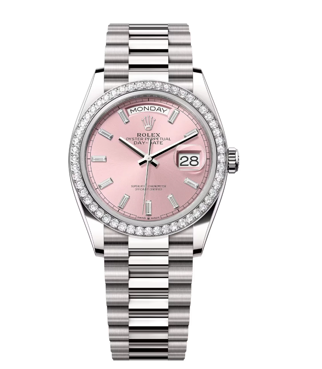 Rolex Day-Date 36 Oyster Perpetual 18 ct white gold pink, diamond-set dial diamond-set bezel President band Reference 128349RBR