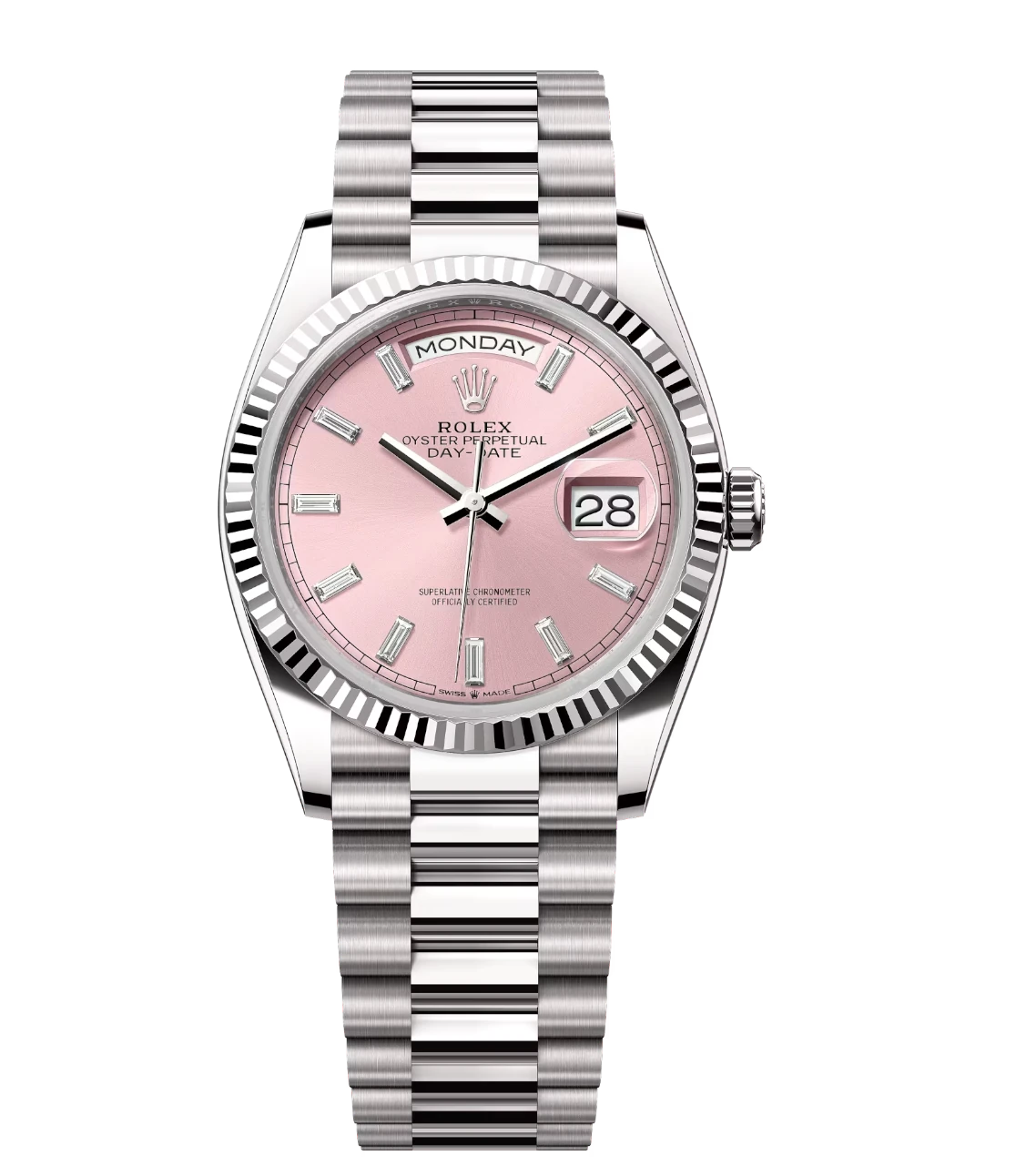 Rolex Day-Date 36 Oyster Perpetual 18 ct white gold pink, diamond-set dial fluted bezel President band Reference 128239