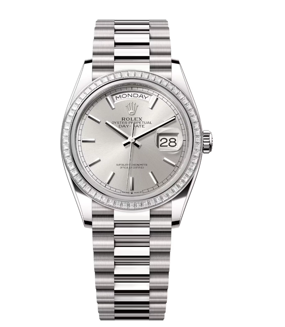 Rolex Day-Date 36 Oyster Perpetual 18 ct white gold silver dial diamond-set bezel President band Reference 128399TBR