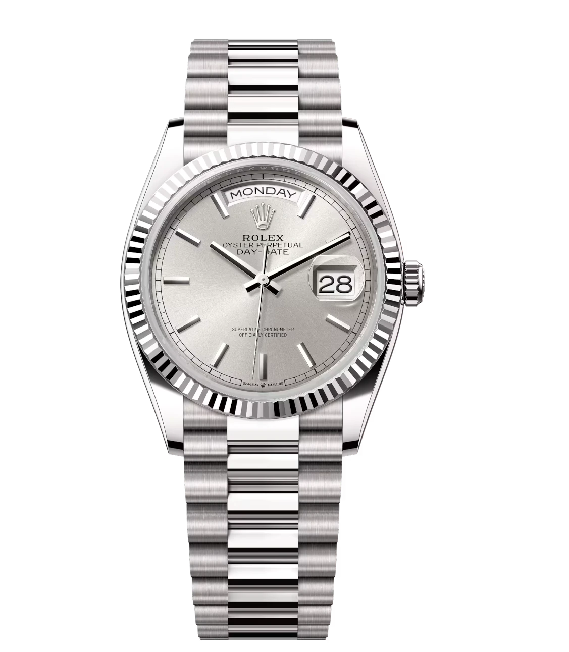 Rolex Day-Date 36 Oyster Perpetual 18 ct white gold silver dial fluted bezel President band Reference 128239