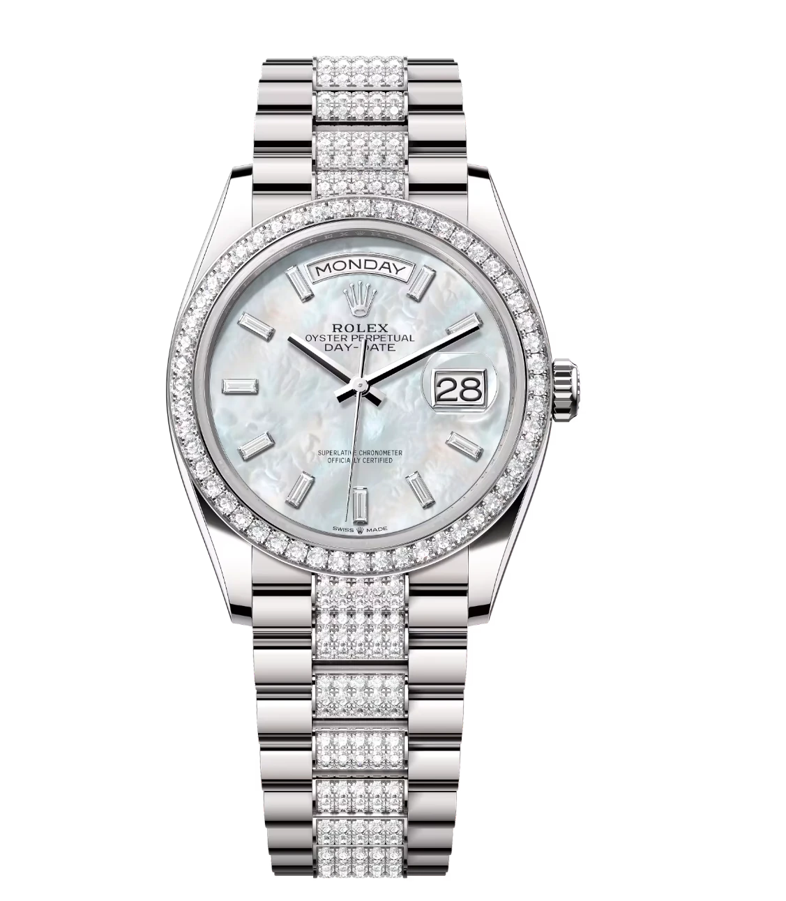 Rolex Day-Date 36 Oyster Perpetual 18 ct white gold white mother-of-pearl, diamond-set dial diamond-set bezel diamond-set President band Reference 128349RBR