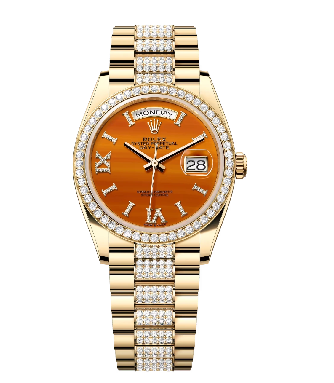 Rolex Day-Date 36 Oyster Perpetual 18 ct yellow gold carnelian, diamond-set dial diamond-set bezel diamond-set President band Reference 128348RBR