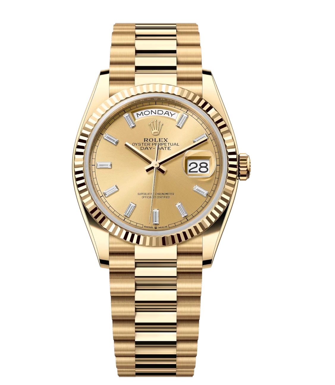 Rolex Day-Date 36 Oyster Perpetual 18 ct yellow gold champagne colour, diamond-set dial fluted bezel President band Reference 128238