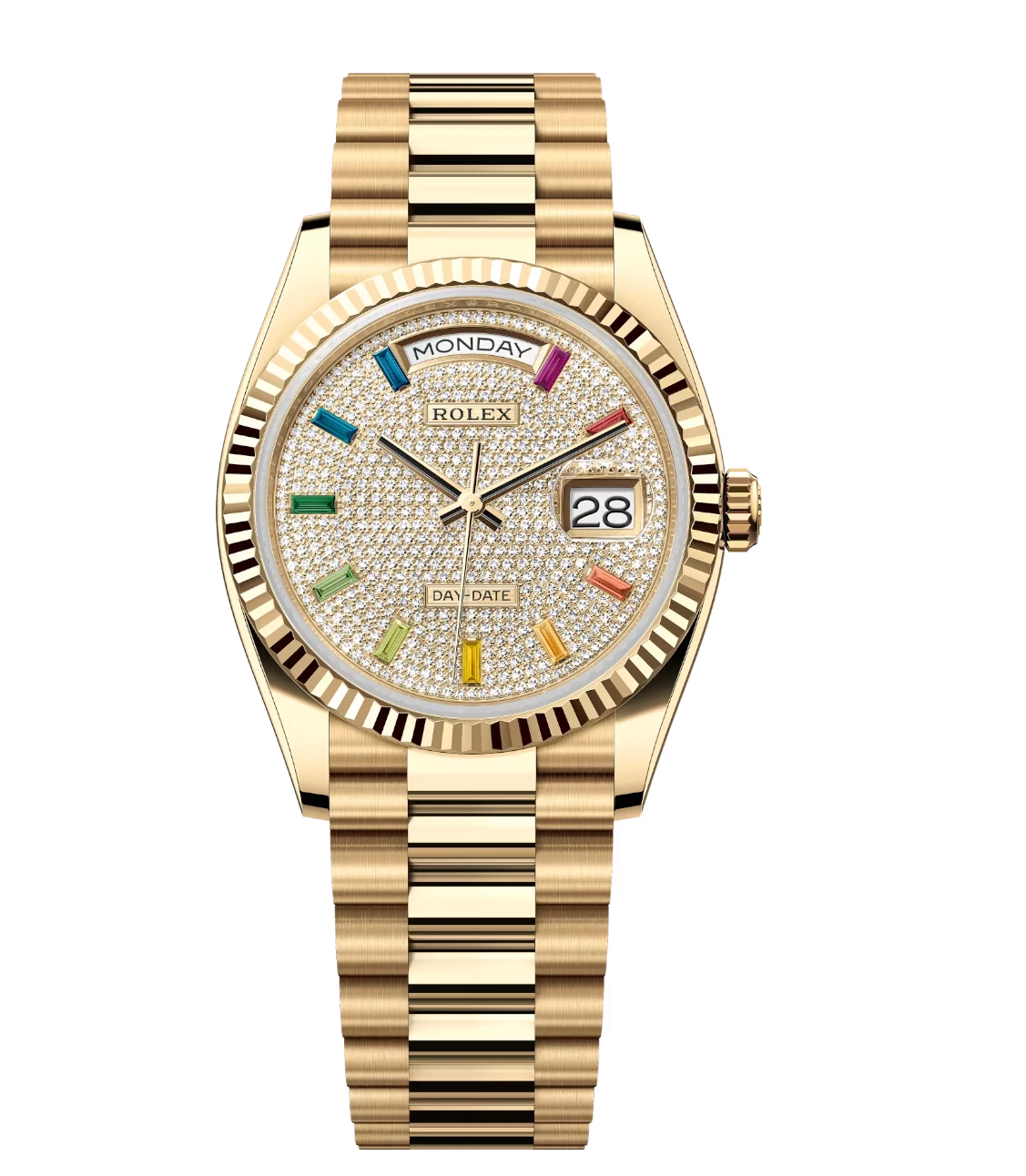 Rolex Day-Date 36 Oyster Perpetual 18 ct yellow gold diamond-paved dial fluted bezel President band Reference 128238