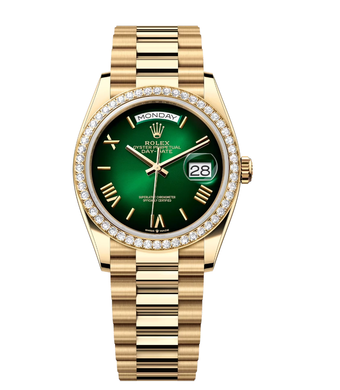 Rolex Day-Date 36 Oyster Perpetual 18 ct yellow gold green ombré dial diamond-set bezel President band Reference 128348RBR