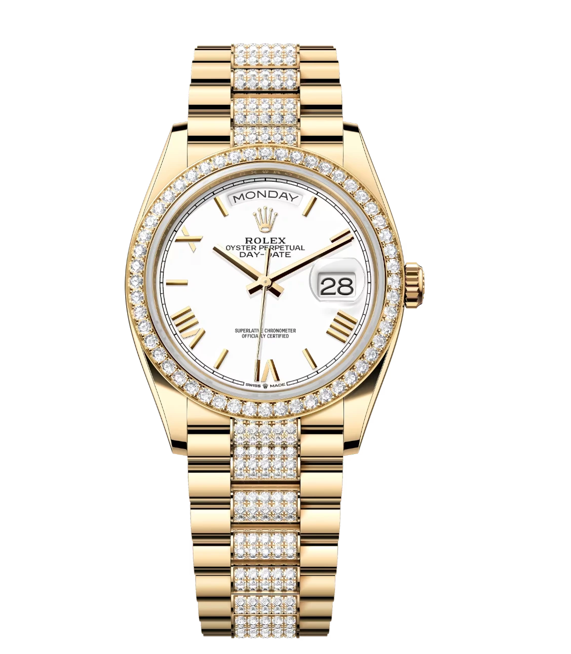 Rolex Day-Date 36 Oyster Perpetual 18 ct yellow gold white dial diamond-set bezel diamond-set President band Reference 128348RBR