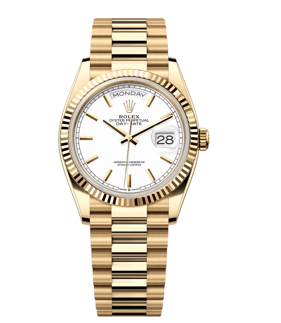 Rolex Day-Date 36 Oyster Perpetual 18 ct yellow gold white dial fluted bezel President band Reference 128238
