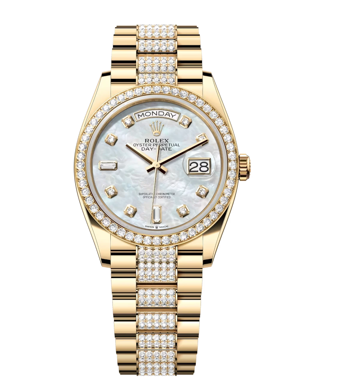Rolex Day-Date 36 Oyster Perpetual 18 ct yellow gold white mother-of-pearl, diamond-set dial diamond-set bezel diamond-set President band Reference 128348RBR