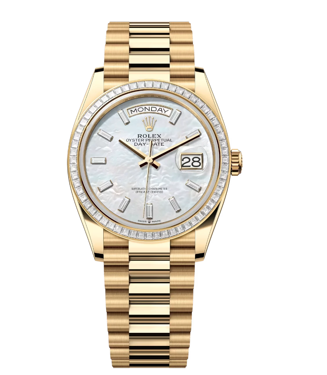 Rolex Day-Date 36 Oyster Perpetual 18 ct yellow gold white mother-of-pearl, diamond-set dial diamond-set bezel President band Reference 128398TBR