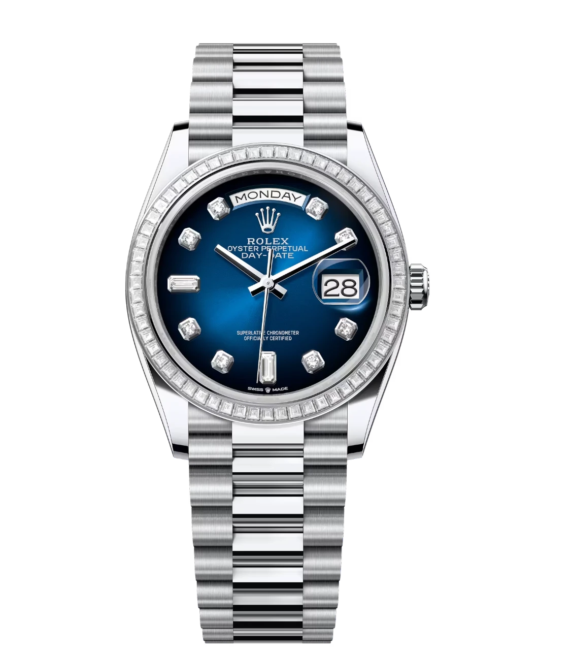 Rolex Day-Date 36 Oyster Perpetual platinum blue ombré, diamond-set dial diamond-set bezel President band Reference 128396TBR