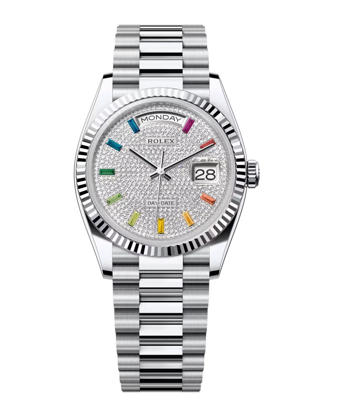 Rolex Day-Date 36 Oyster Perpetual platinum diamond-paved dial fluted bezel President band Reference 128236