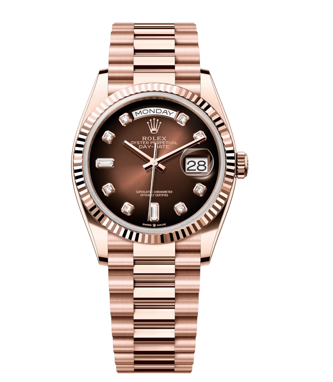 Rolex Day-Date 36 Oyster Perpetual 18 ct Everose gold brown ombré, diamond-set dial fluted bezel President band Reference 128235