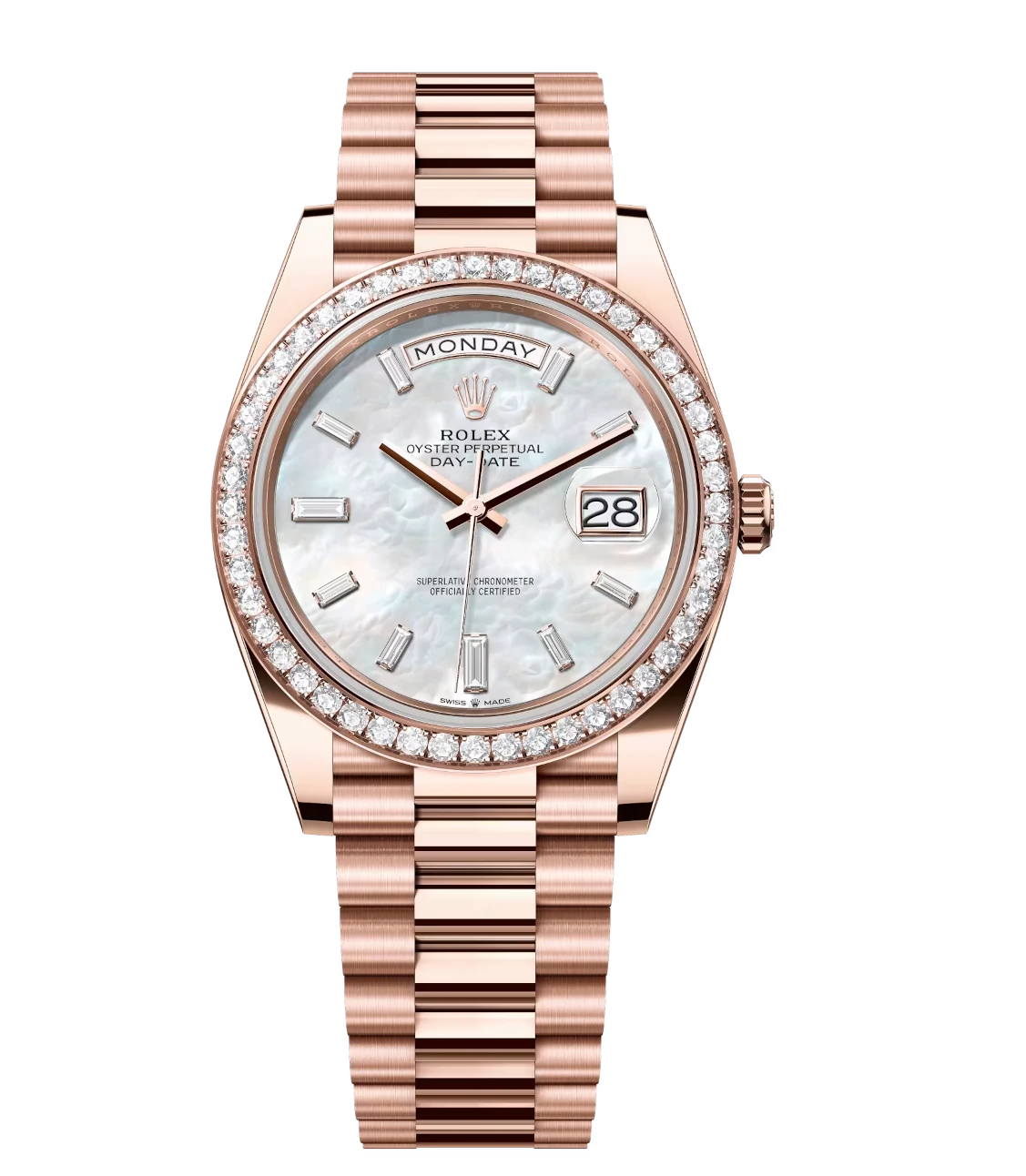 Rolex Day-Date 40 Oyster Perpetual 18 ct Everose gold white mother-of-pearl, diamond-set dial diamond-set bezel President band Reference 228345RBR