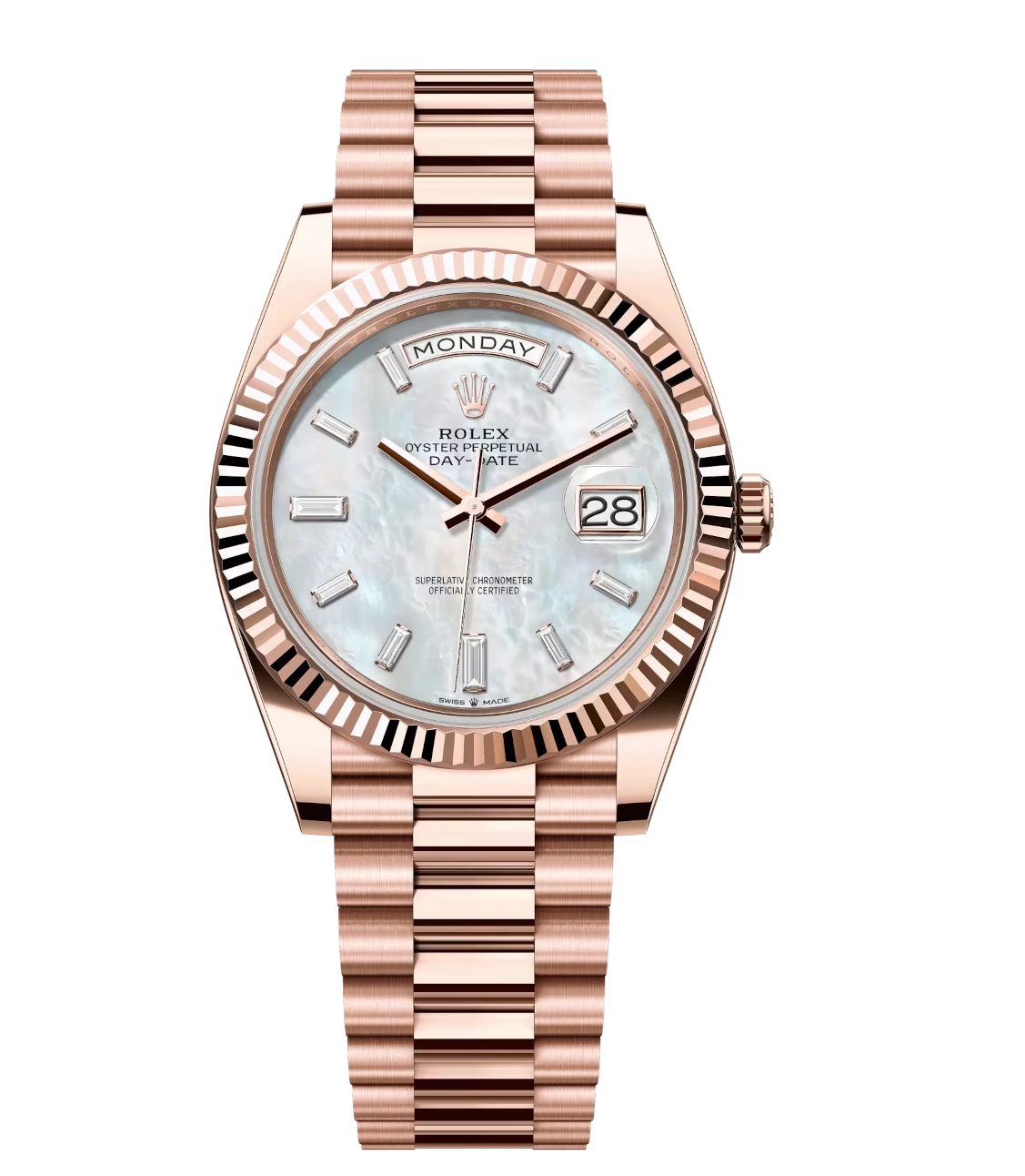 Rolex Day-Date 40 Oyster Perpetual 18 ct Everose gold white mother-of-pearl, diamond-set dial fluted bezel President band Reference 228235