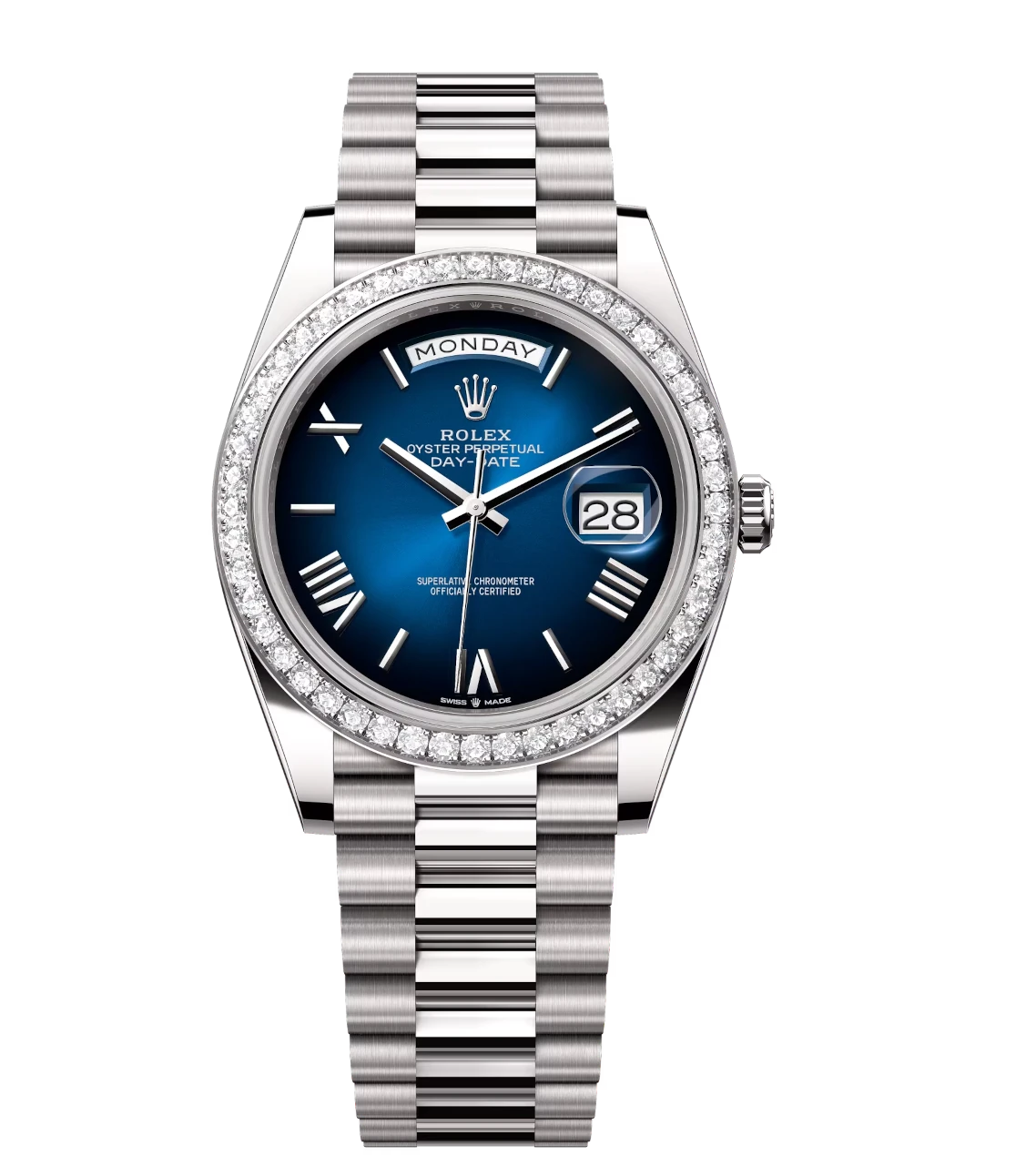 Rolex Day-Date 40 Oyster Perpetual 18 ct white gold blue ombré dial diamond-set bezel President band Reference 228349RBR