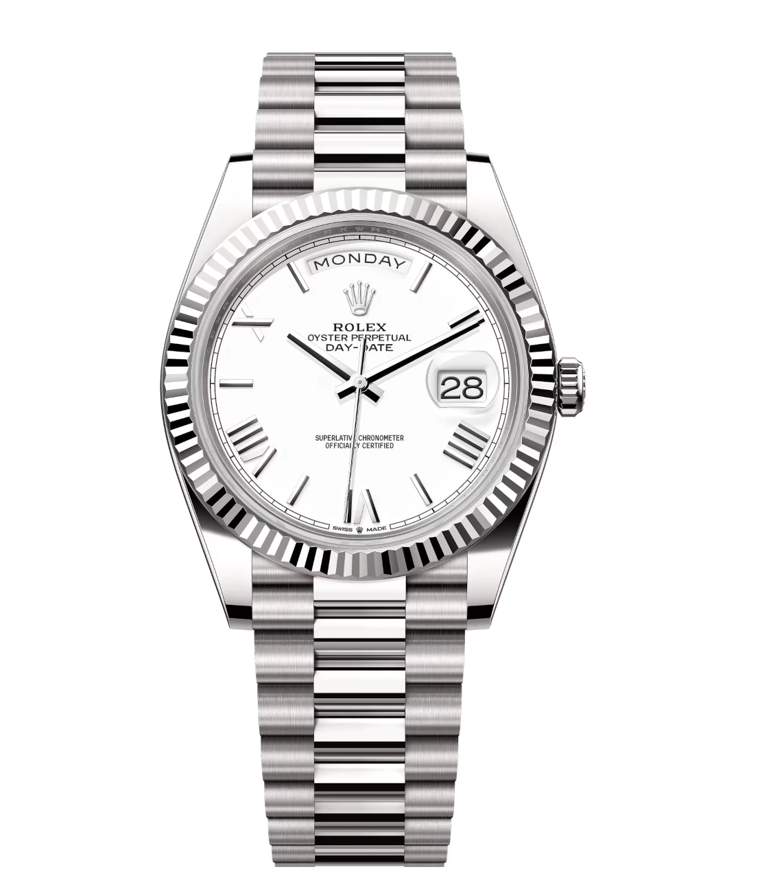 Rolex Day-Date 40 Oyster Perpetual 18 ct white gold white dial fluted bezel President band Reference 228239