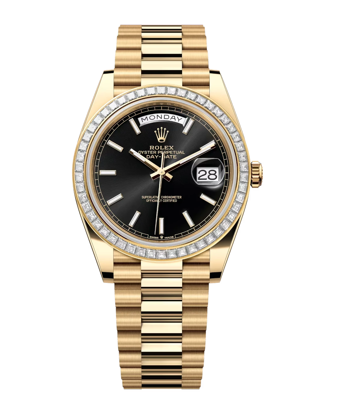 Rolex Day-Date 40 Oyster Perpetual 18 ct yellow gold bright black dial diamond-set bezel President band Reference 228398TBR