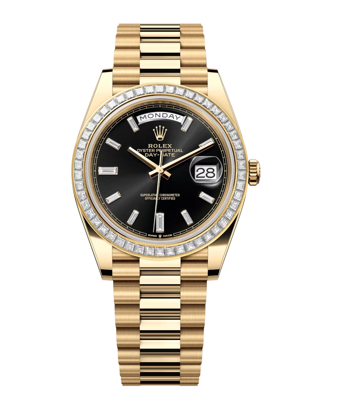 Rolex Day-Date 40 Oyster Perpetual 18 ct yellow gold bright black, diamond-set dial diamond-set bezel President band Reference 228398TBR