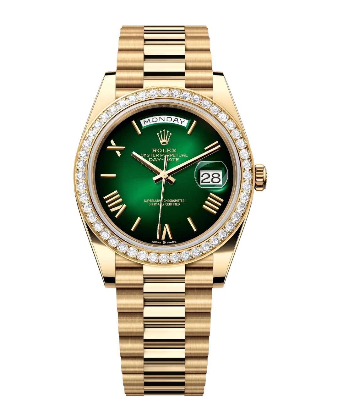 Rolex Day-Date 40 Oyster Perpetual 18 ct yellow gold green ombré dial diamond-set bezel President band Reference 228348RBR