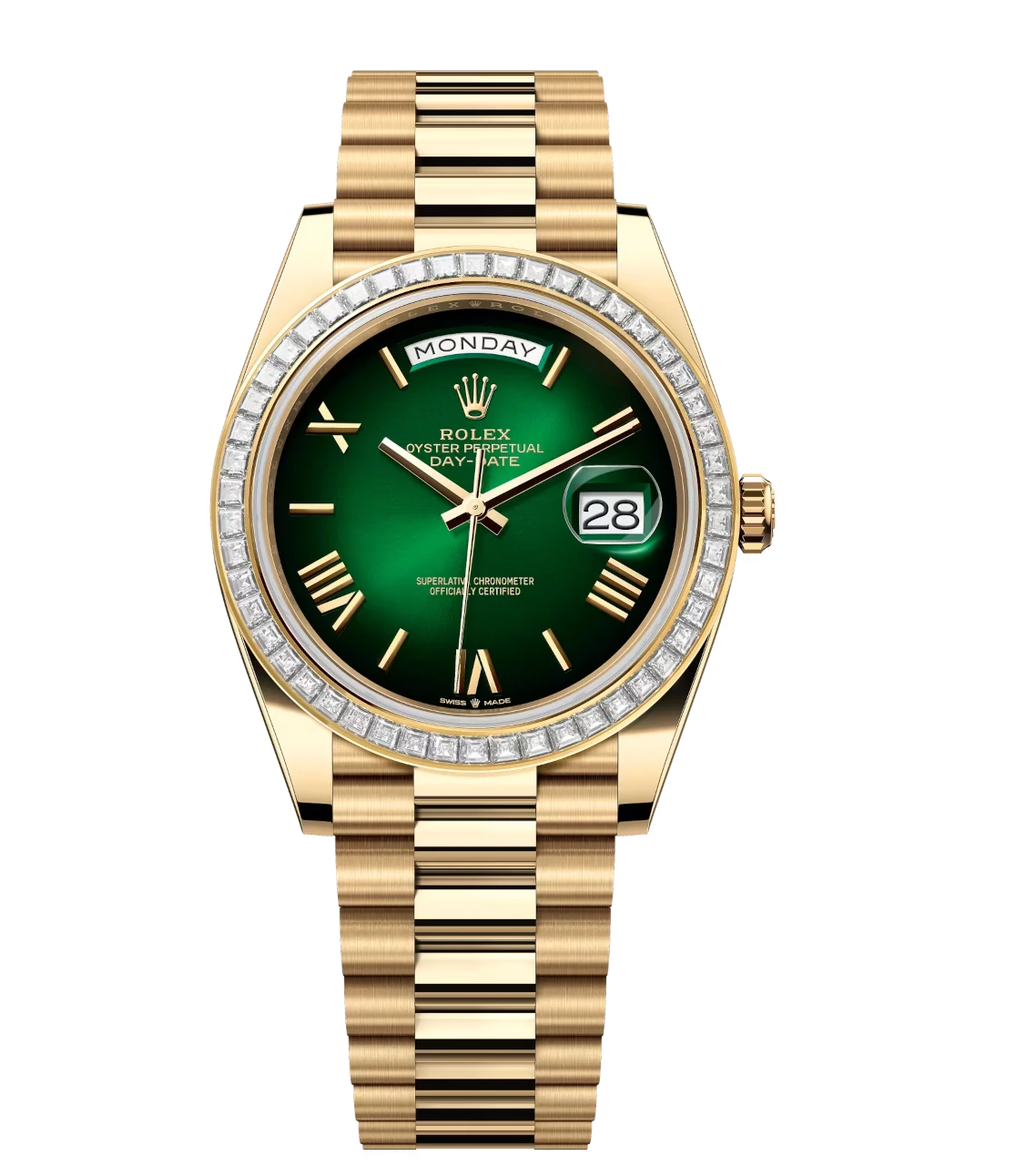 Rolex Day-Date 40 Oyster Perpetual 18 ct yellow gold green ombré dial diamond-set bezel President band Reference 228398TBR