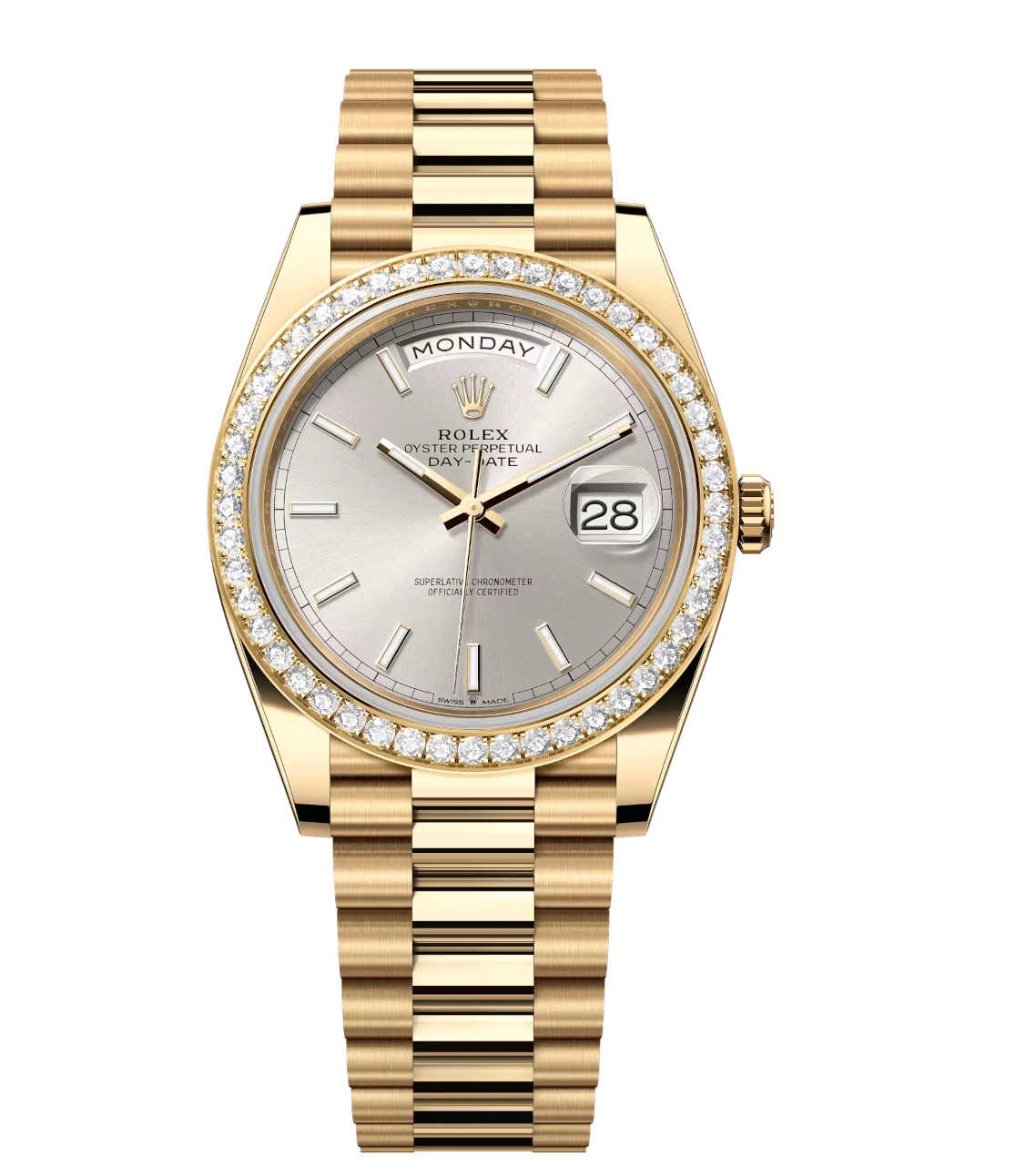 Rolex Day-Date 40 Oyster Perpetual 18 ct yellow gold silver dial diamond-set bezel President band Reference 228348RBR