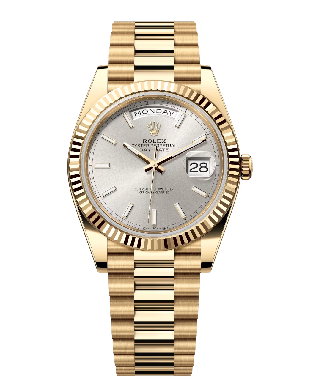 Rolex Day-Date 40 Oyster Perpetual 18 ct yellow gold silver dial fluted bezel President band Reference 228238