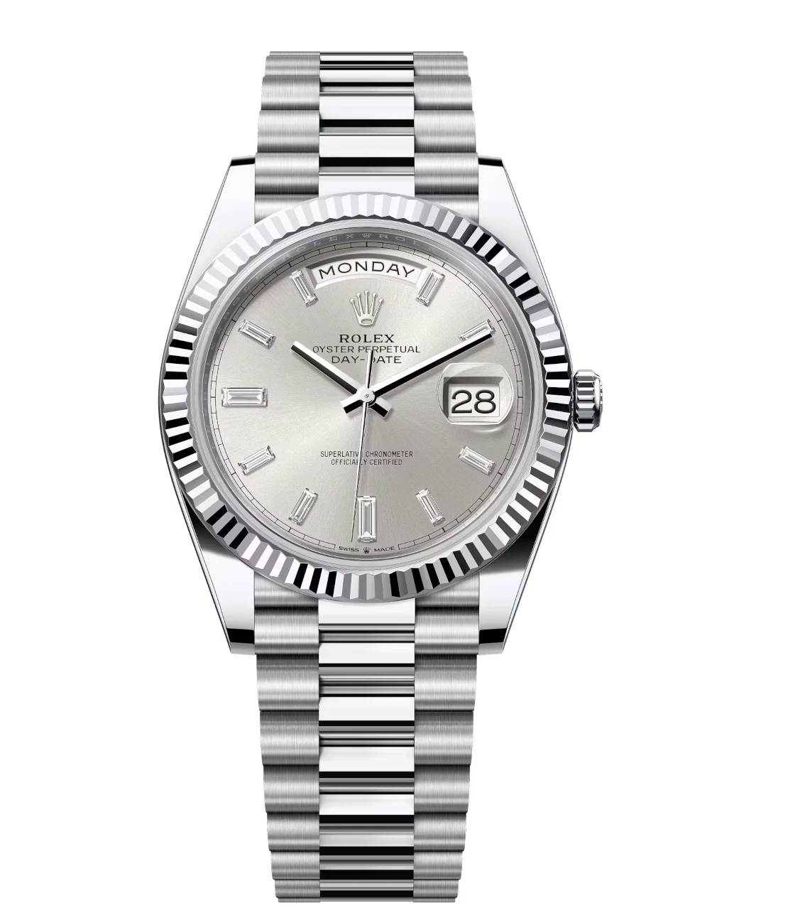 Rolex Day-Date 40 Oyster Perpetual platinum silver, diamond-set dial fluted bezel President band Reference 228236